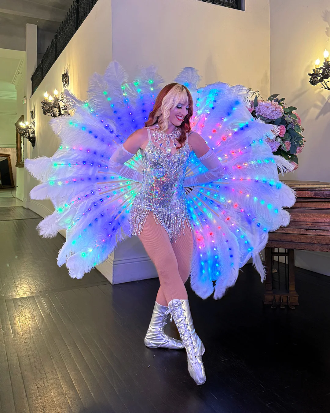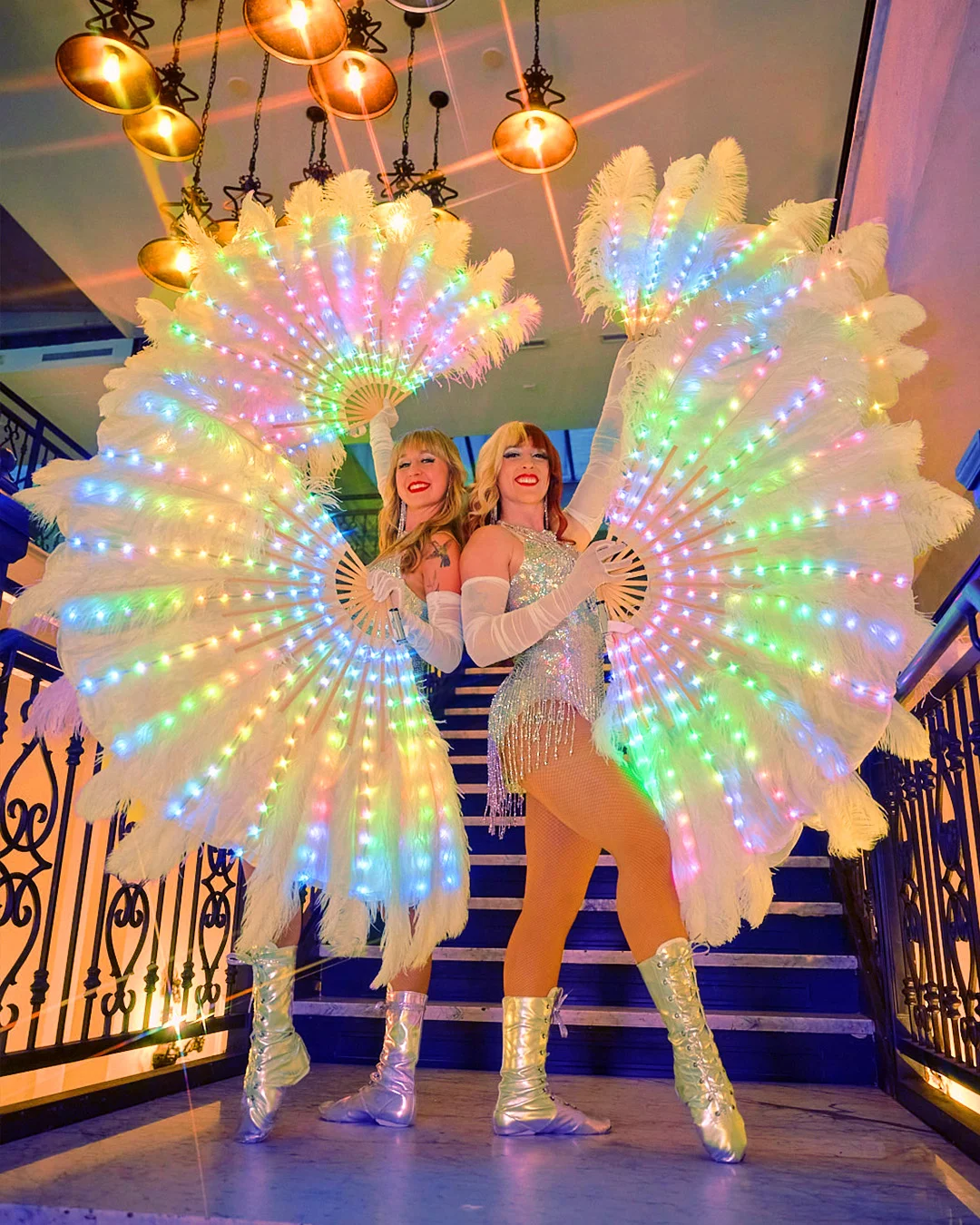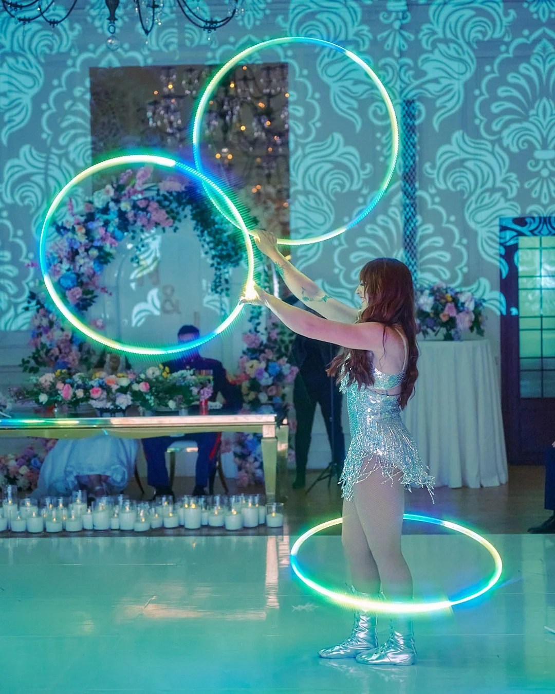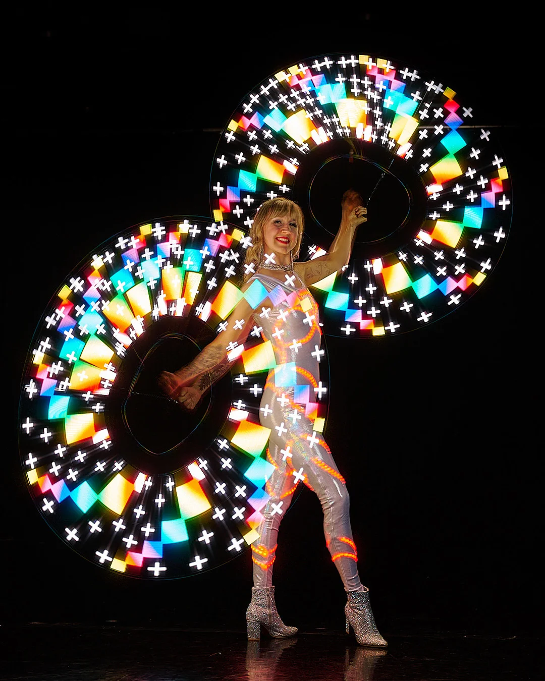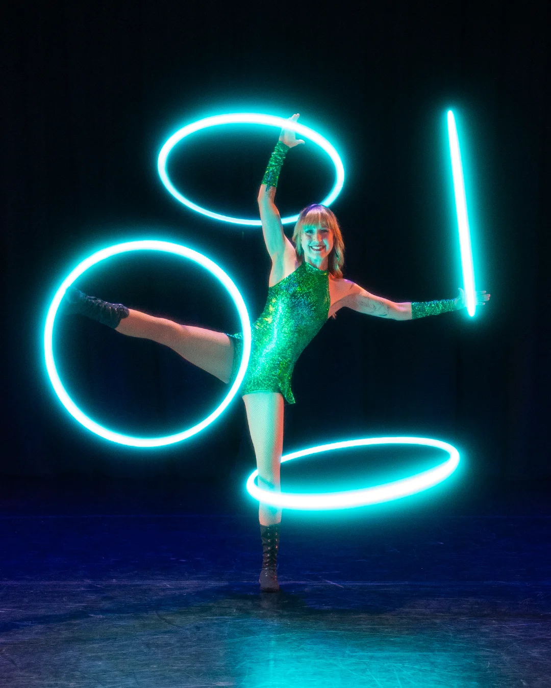Our LED dance shows are unlike anything else in the world. Our lights move in perfect harmony with the choreography and music, creating a mesmerizing, fully immersive experience. While our specialty is hula hoop, our precisely choreographed shows blend a stunning array of LED props including poi, staffs, fans, wings, hula hoops, and more.