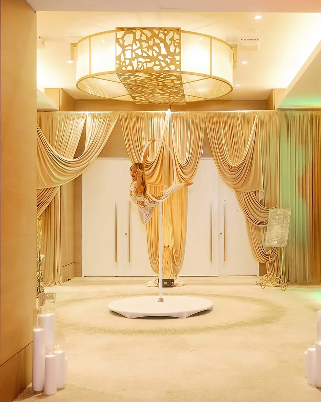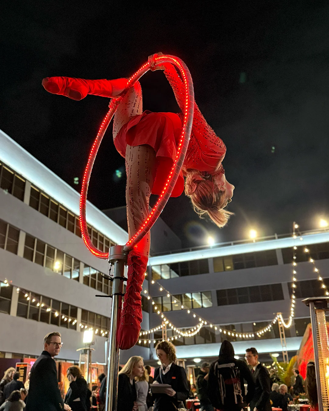 Available for ambient performances or choreographed shows, our Lollipop Aerialists blend aerial hoop skills with pole and dance for a visually stunning display.