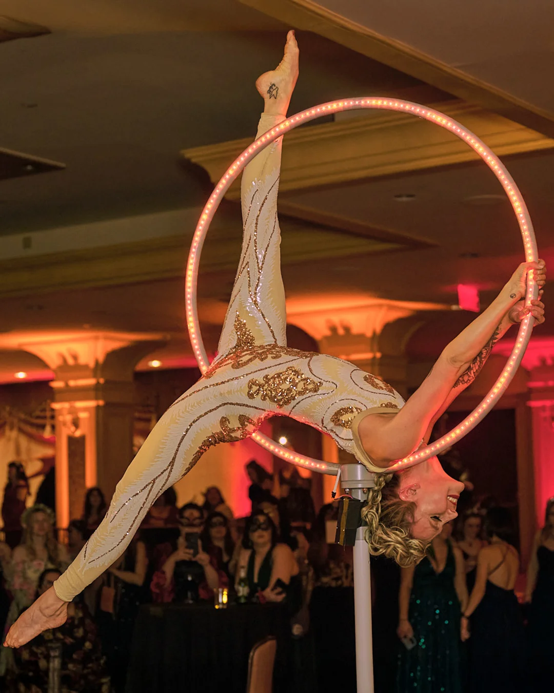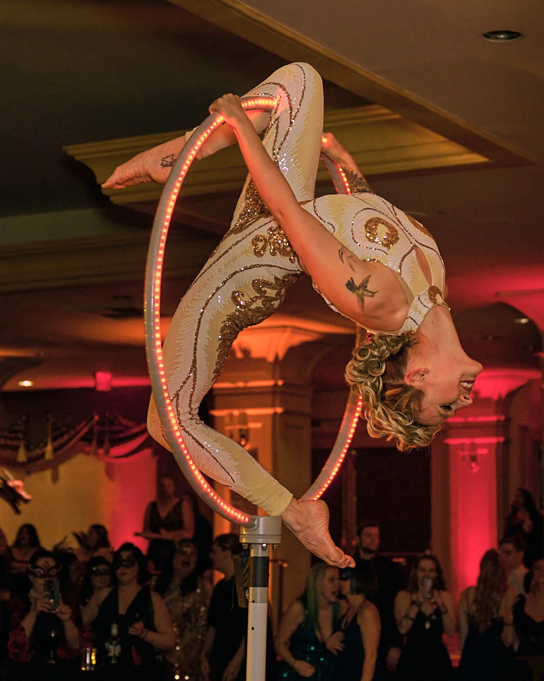 Our Lollipop Aerialists bring the enchantment of a lyra (aerial hoop) performance to your event without the need for high ceilings. This captivating act is ideal for intimate venues standing at 10.5’ tall with a circular footprint that has an 8’ diameter.