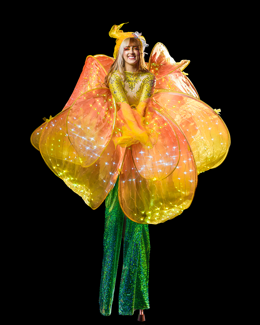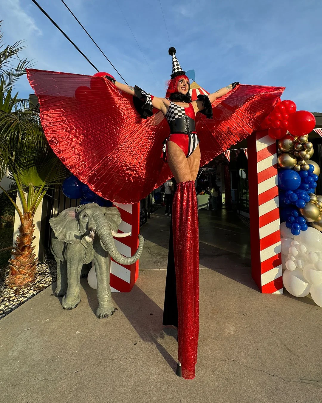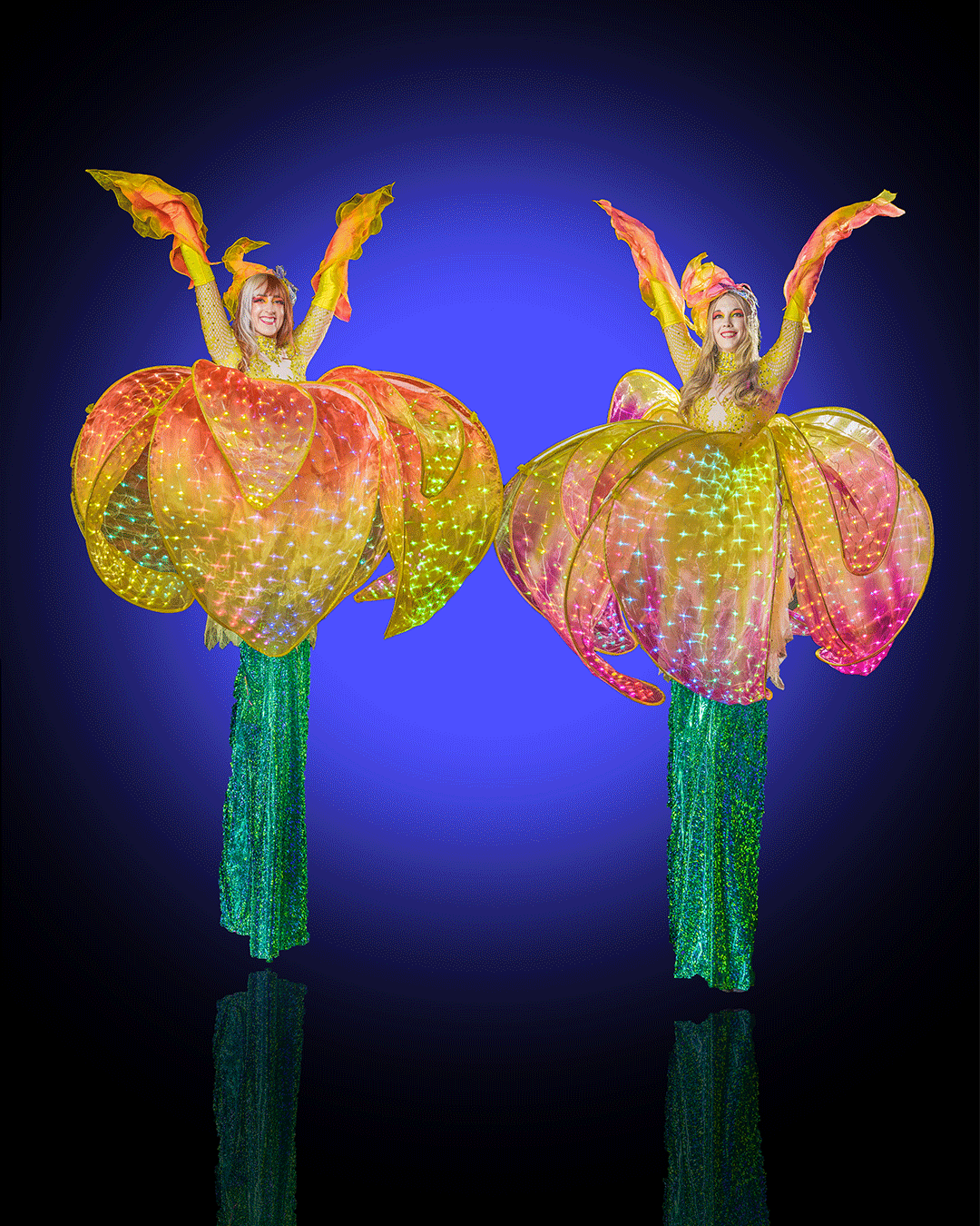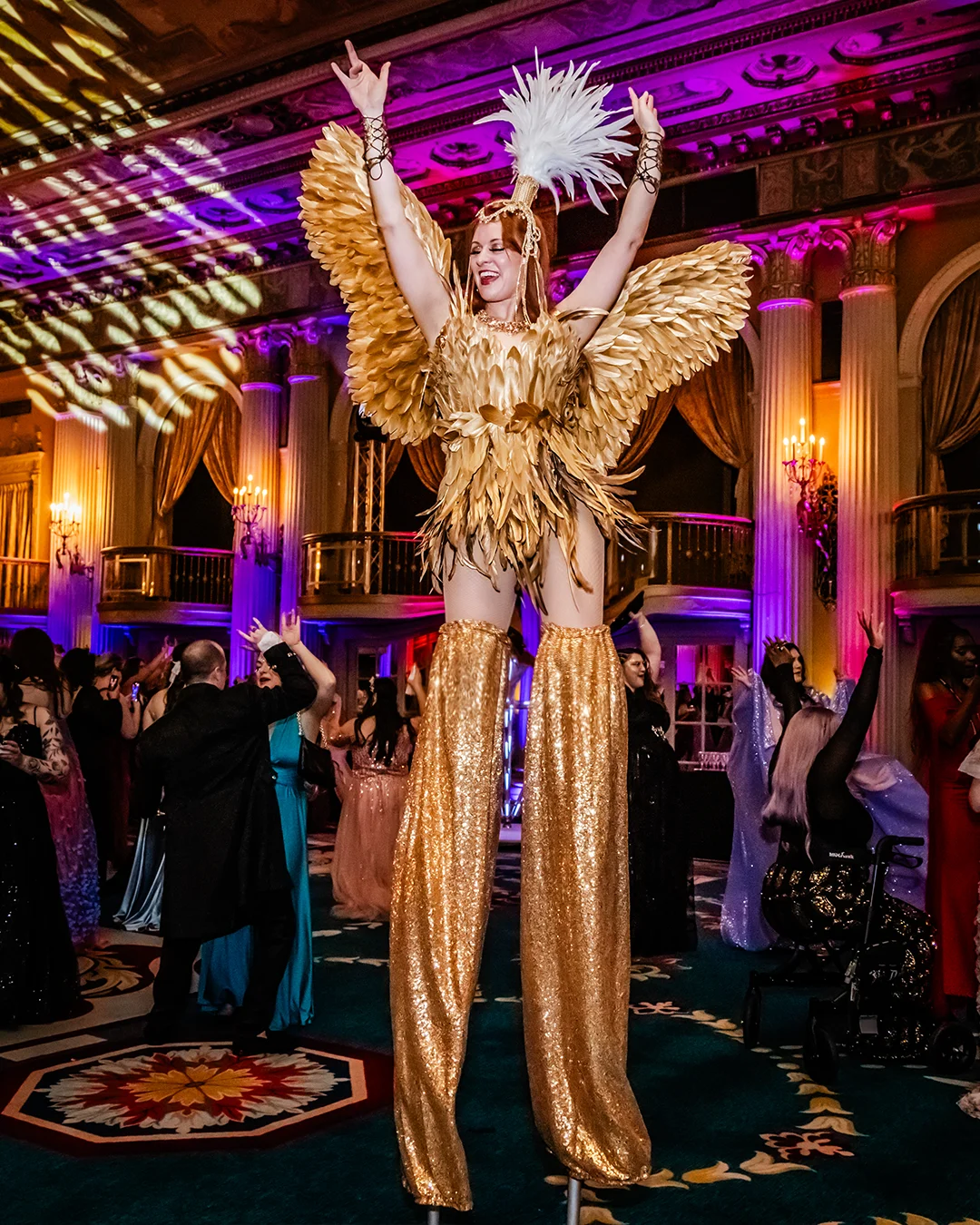 Each stilt walker embodies your theme with bespoke costuming and in-character charisma, from elegant and formal to playful and colorful! Whether welcoming guests, roaming the crowd, or posing for photos with guests, our stilt walkers quite literally stand above the rest!